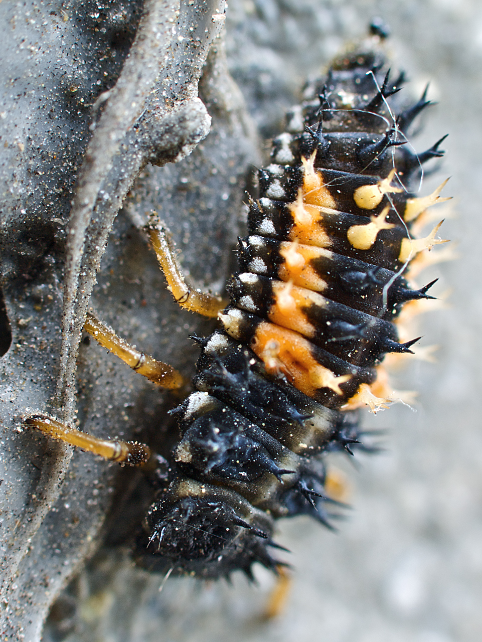 | 2008 06/14 21:17:53 植物園にて ナミテントウの幼虫。10匹くらいが 皆コンクリートの壁にくっついていたが、 やはり葉っぱの上に居るのを撮っておきたいところ。 OLYMPUS ZUIKO DIGITAL 35mm F3.5 Macro + EX-25 |