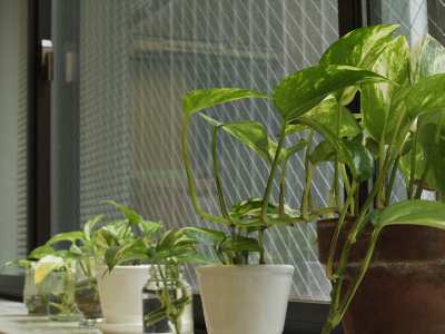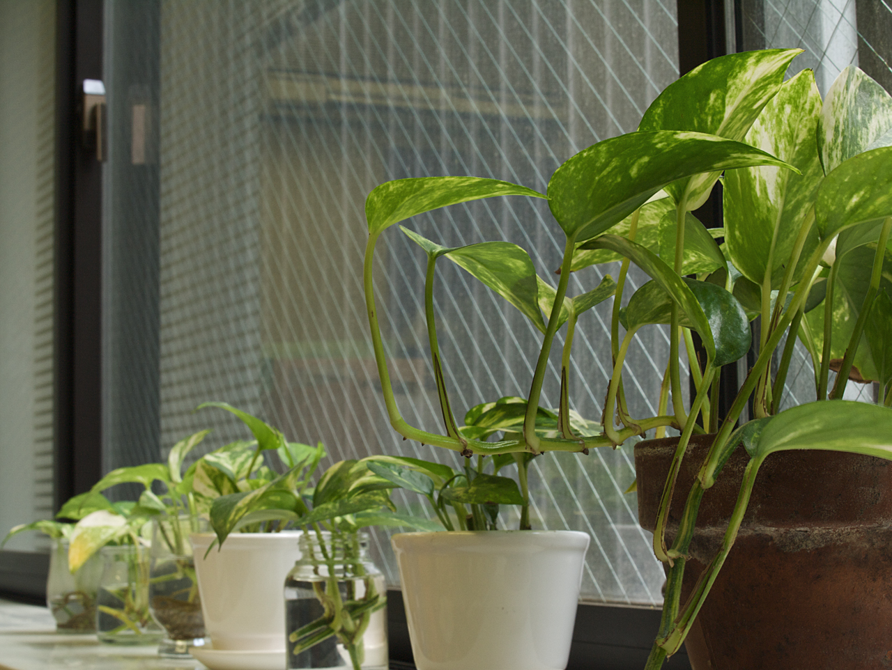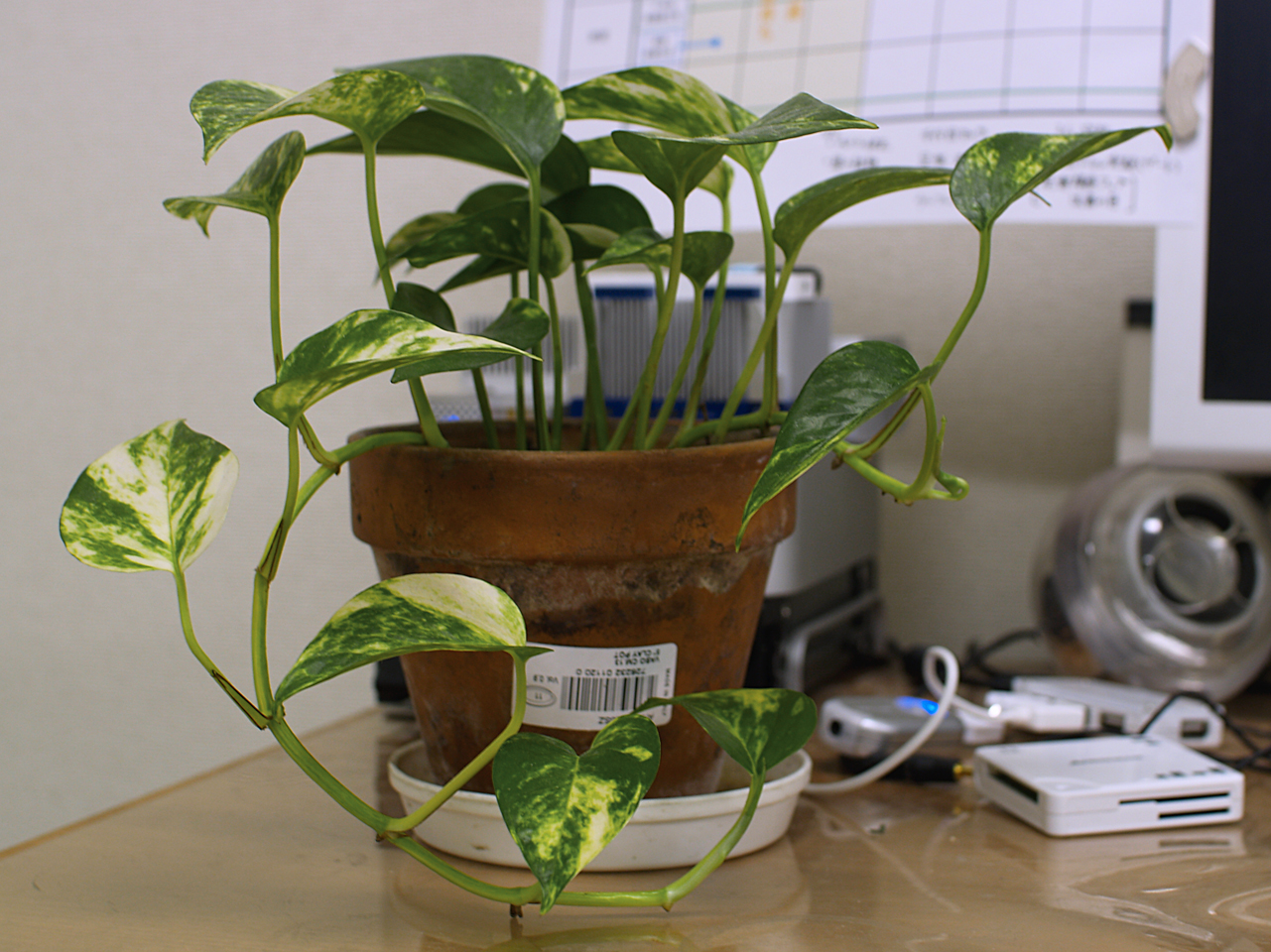 | 2008 06/29 13:26:20 本日はあまり出歩く暇が無いので 窓際の ポトス農場でも。 一年半前に実家より譲ってもらった鉢の 伸びすぎた分をジャム瓶などに株分けしていたら いつの間にか6つも増えてしまった。 下の写真はうちへ来た当時のもの。 OLYMPUS ZUIKO DIGITAL 35mm F3.5 Macro |