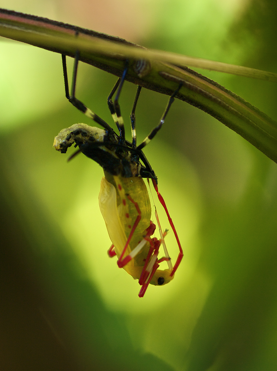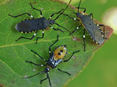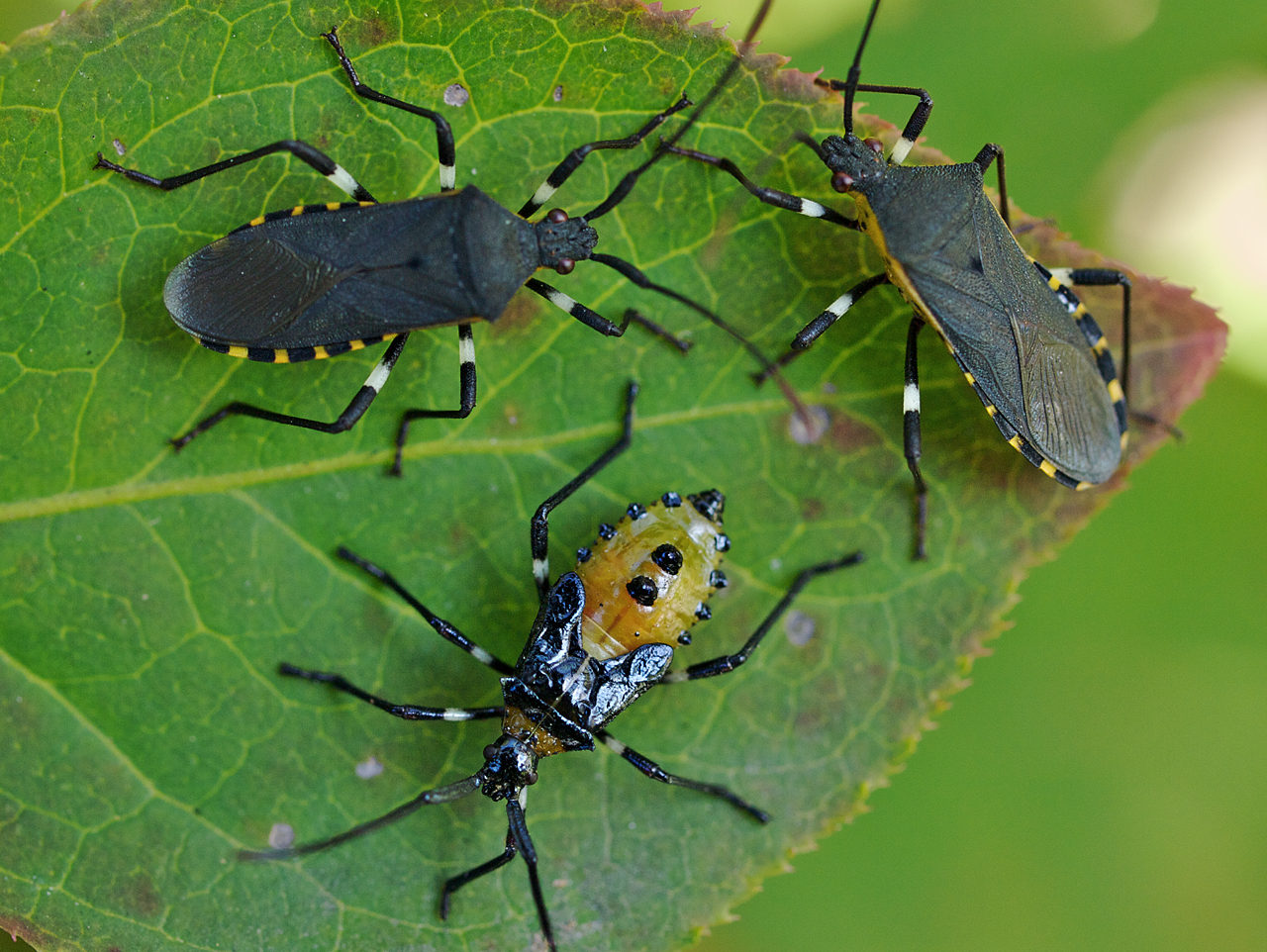 | 2008 10/04 18:43:07 昨日載せたキバラヘリカメムシの幼虫(下1匹)と 成虫(上2匹)。羽化直後の色が どちらにも似つかず 面白い。赤い部分が乾くと黒くなるのか。 OLYMPUS ZUIKO DIGITAL ED 50mm F2.0 Macro |
