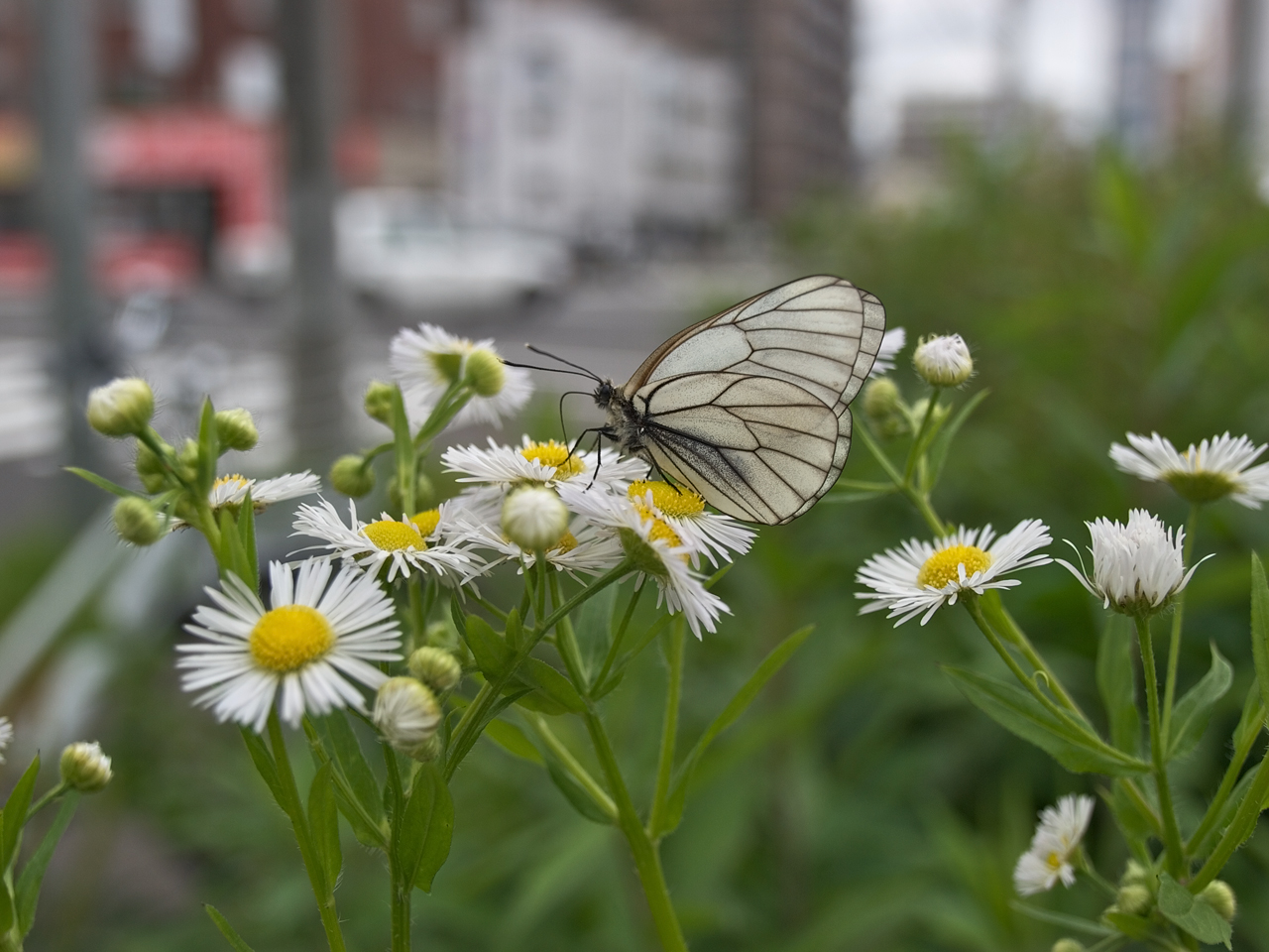 | 2009 07/01 19:59:40 ビルの玄関で自動ドアの内側に閉じ込められていた エゾコマルハナバチと、珍しく非マクロで撮った エゾシロチョウ。 OLYMPUS ZUIKO DIGITAL 11-22mm F2.8-3.5 |
