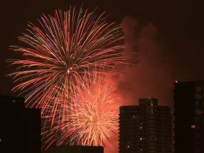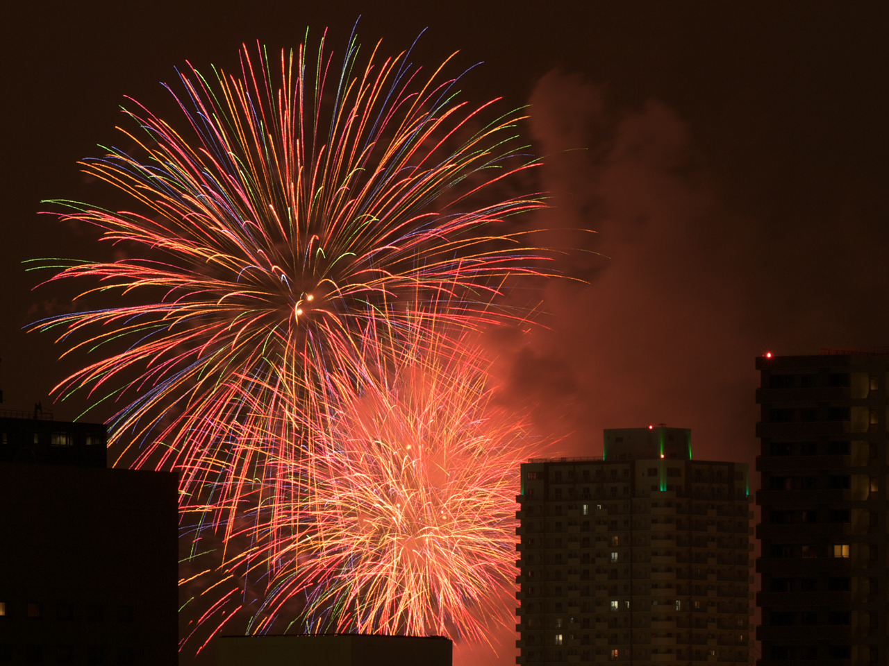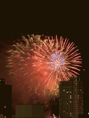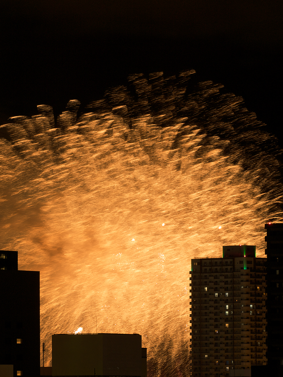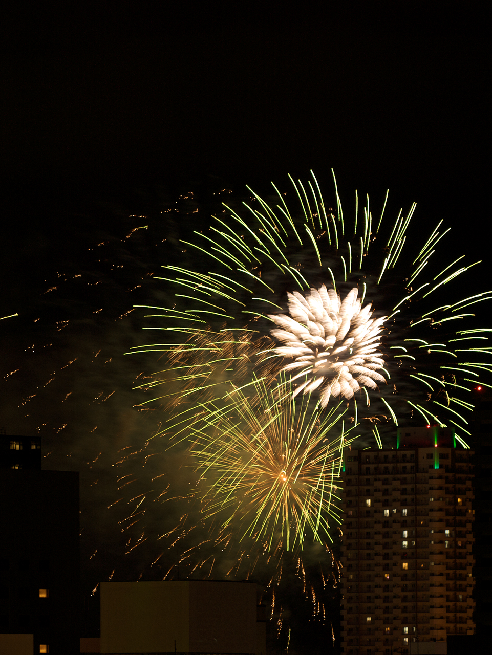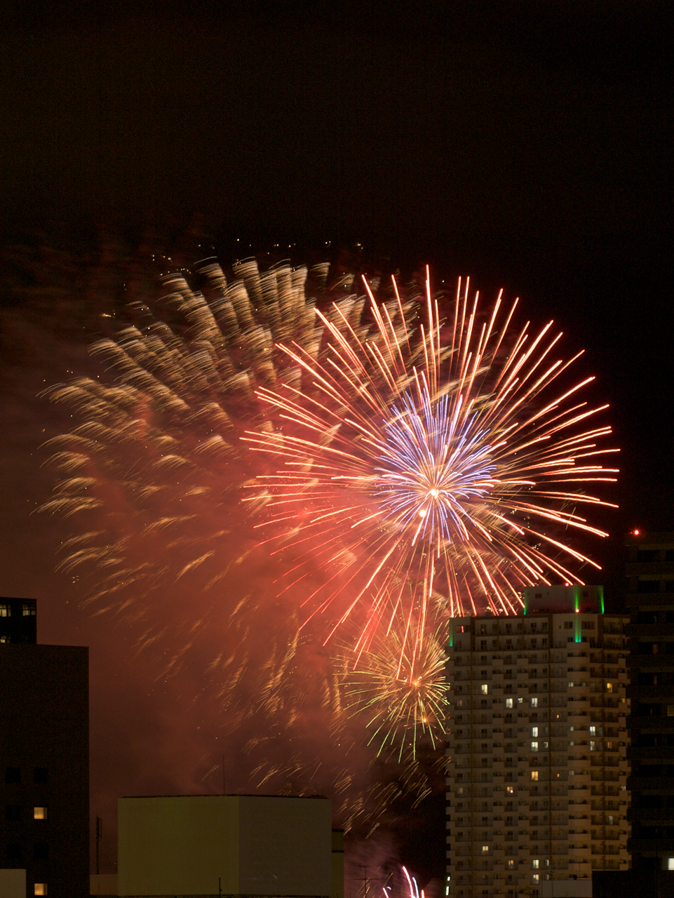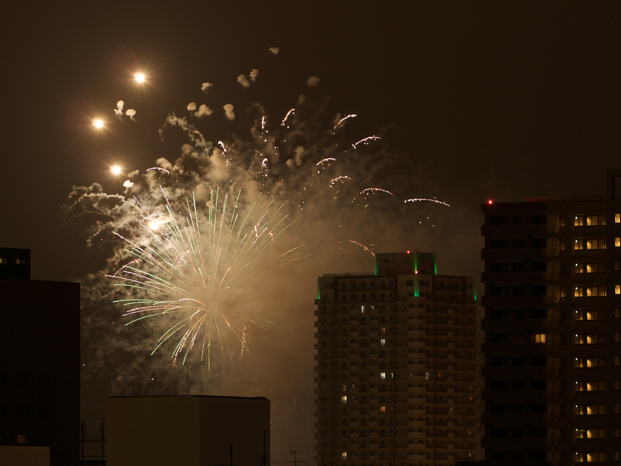 | 2009 07/24 21:44:22 屋上より花火大会。会場は南9条橋で、距離は 2km半くらい。換算300mmだと少し広いため 横位置で撮って左右を詰めたが、 まだ足りない気がする。 SIGMA APO MACRO 150mm F2.8 EX DG HSM |