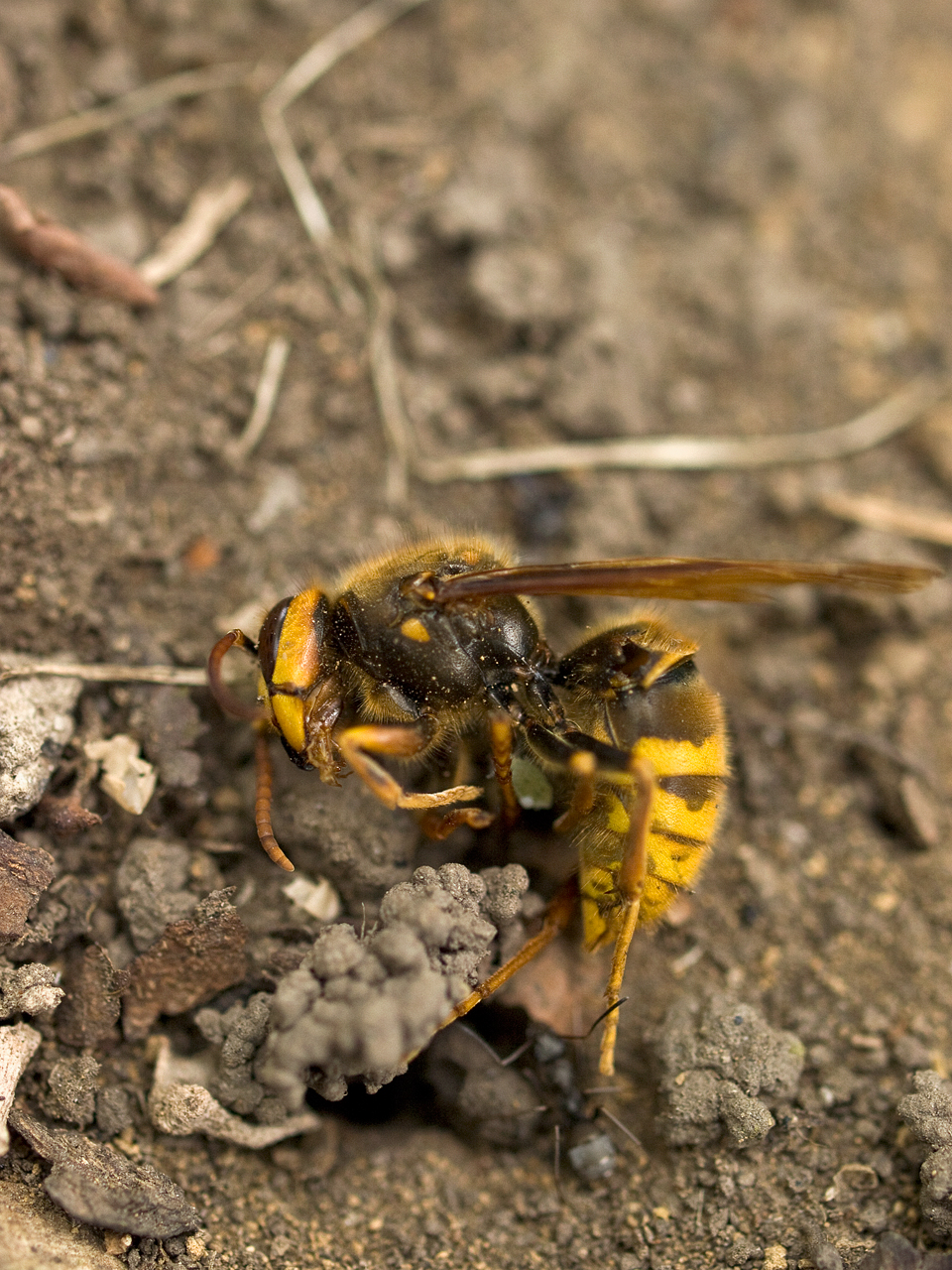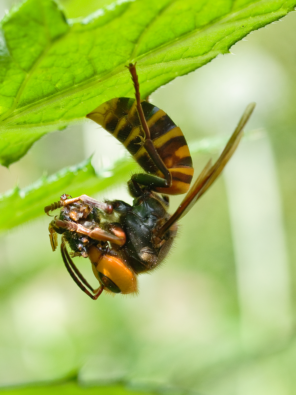 | 2009 08/14 15:33:31 北大植物園にて、他種のハチを狩るオオスズメバチ。 捕獲してから肉団子になるまで2分かからなかった。 下のキノコは、昨日の夕方 三岸好太郎美術館中庭で 見つけたもの。 OLYMPUS ZUIKO DIGITAL ED 50mm F2.0 Macro |
