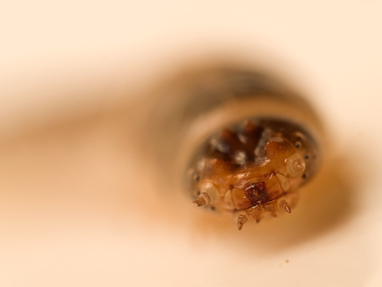 | 2009 10/16 13:52:15 差し入れで頂いたキノコに潜んでいた 体長1〜1.5cmくらいの幼虫。 5匹ほど育てて正体を調べる予定。 羽化までの間生きのこってくれればよいが。 OLYMPUS ZUIKO AUTO-MACRO 20mm F2.0 |