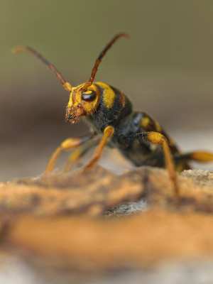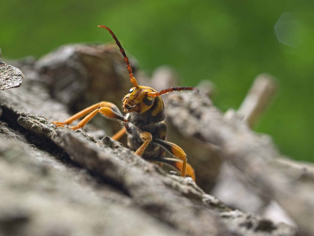 2010 08/04 22:40:23 道端で見かけた小柄なオオフタオビドロバチと、 いつも通り美術館中庭にあるクワの樹に居た トラフカミキリ。 OLYMPUS ZUIKO DIGITAL ED 50mm F2.0 Macro | |