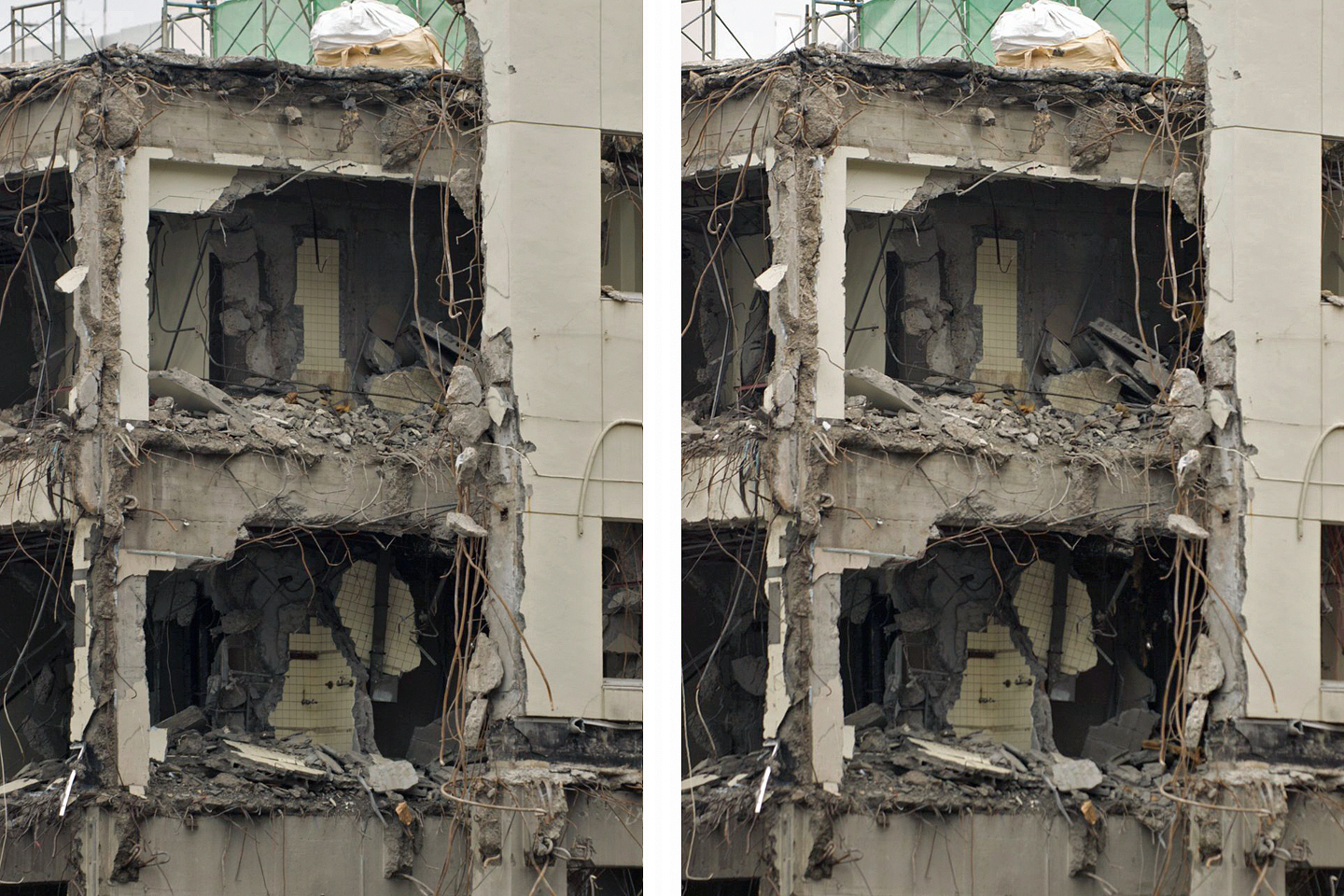 2010 08/26 19:49:43 近所の取り壊し現場を見ていたら ふと 思いついたので、立体視用に撮影・調整してみた。 実際は基準面のピントがずれていたりするが、 表示サイズを適宜調節の上 交差法で見ると そこそこ立体的に感じる‥と思う。 SIGMA APO MACRO 150mm F2.8 EX DG HSM | |