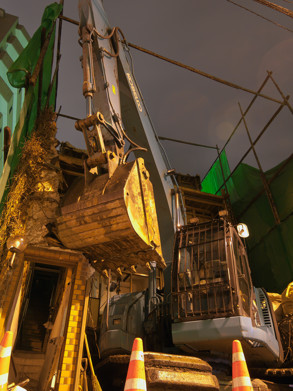 2010 11/10 04:06:50 買い出し途中にあった解体現場。 仕事で久々に PerlからPHPへのソフト移植など やっていたら、思いの他手間取ってしまった ‥ので 写真の方はしばし隔日に。 OLYMPUS ZUIKO DIGITAL 11-22mm F2.8-3.5 |