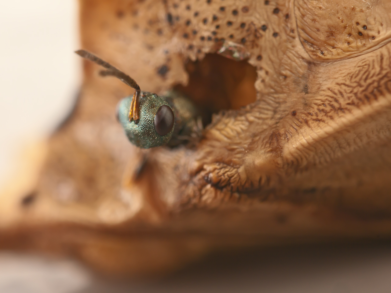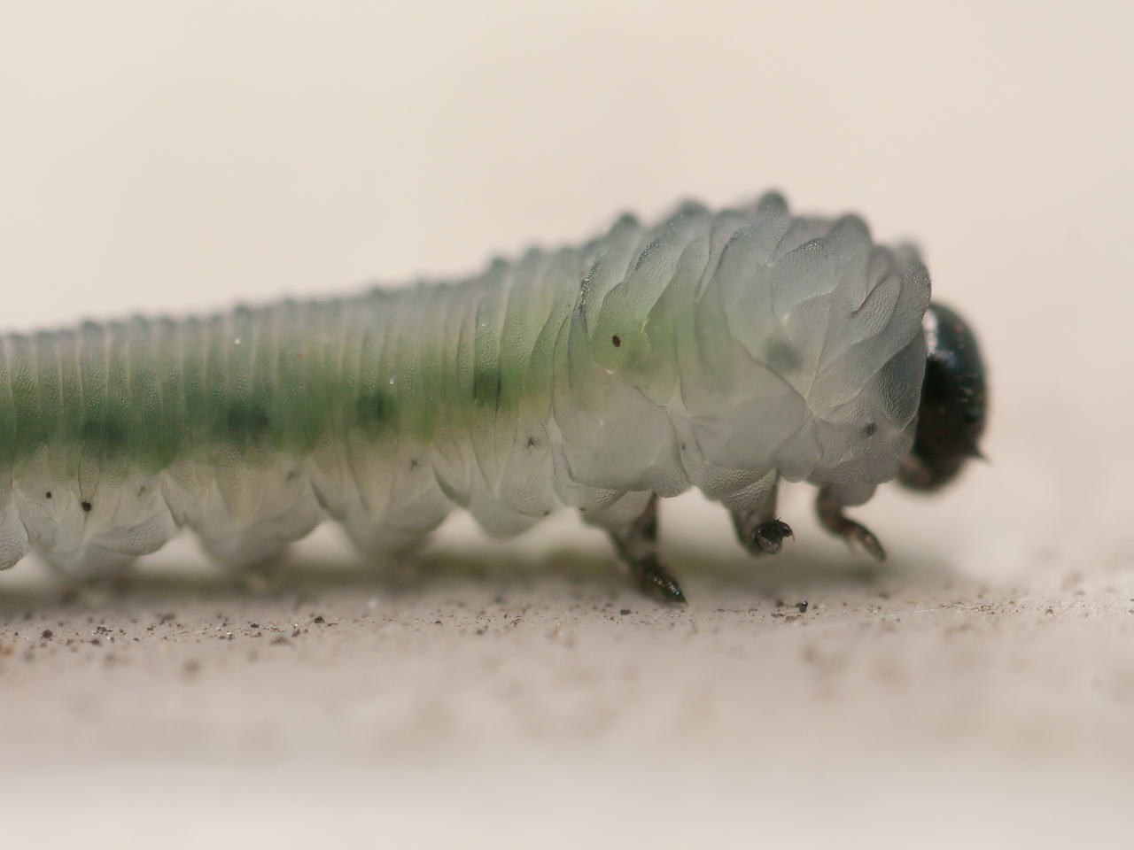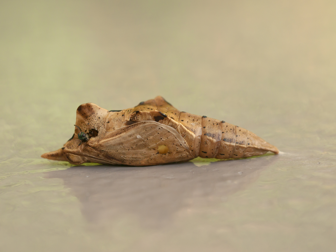 2010 11/13 17:45:32 資料を探しに街まで行った帰りに見つけた、 ビルの壁にくっついている蝶の蛹 ‥に寄生していたが 羽化の際に 力尽きてしまったと思われる蜂のような虫。 近くを歩いていた半透明の幼虫は 多分セグロカブラハバチ。 上述のものとはまた違う感じ。 OLYMPUS ZUIKO AUTO-MACRO 20mm F2.0 |
