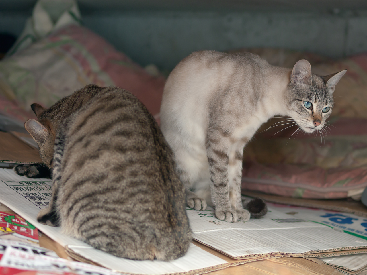 2010 11/20 20:43:49 街の帰りにいつもの場所で、食料をねだる猫。 こちらは比較的食い意地が張っていて愛嬌があり、 もう一匹の白っぽい(目の青い)方は割とすました感じ。 OLYMPUS ZUIKO DIGITAL ED 50mm F2.0 Macro |