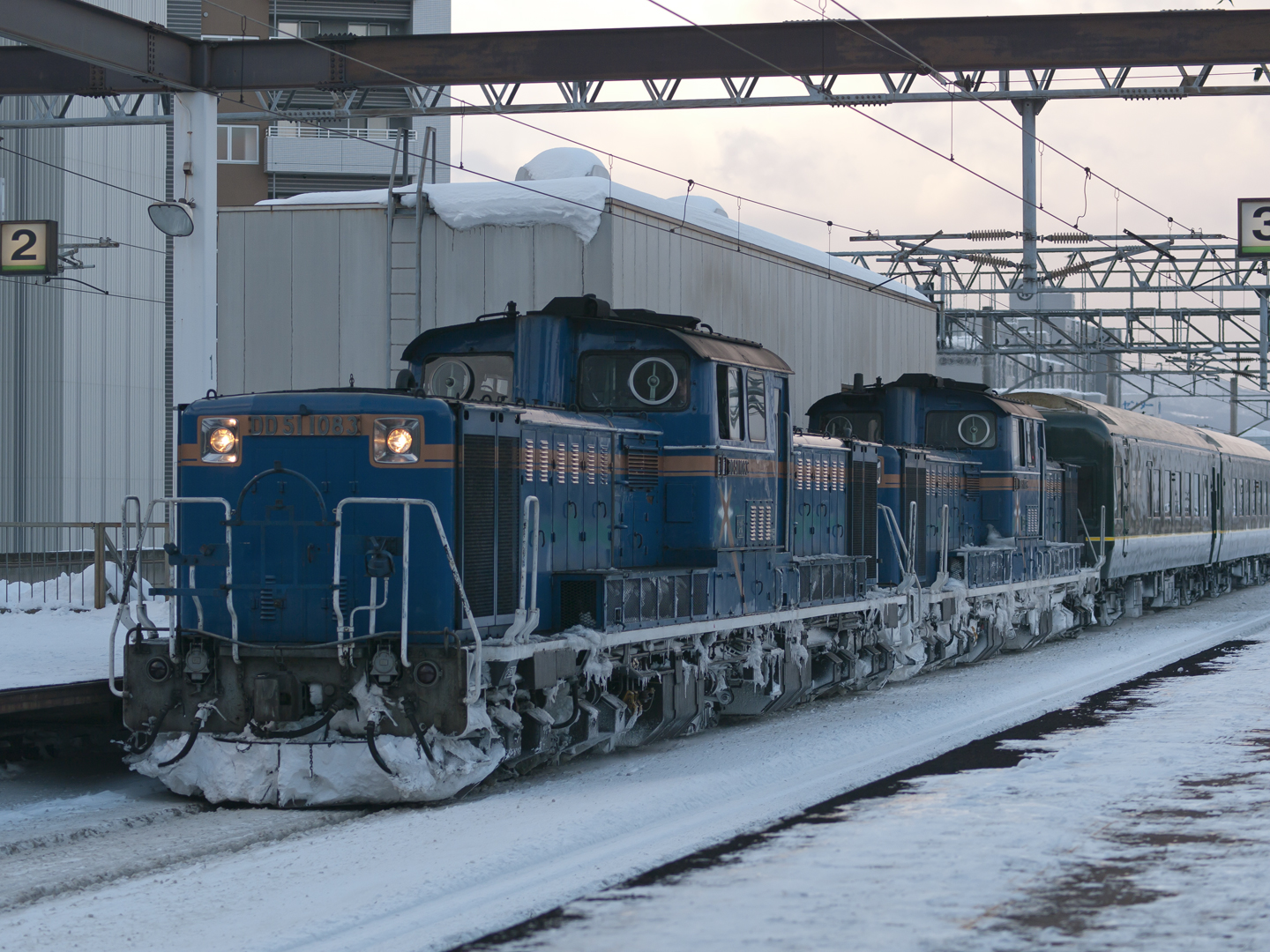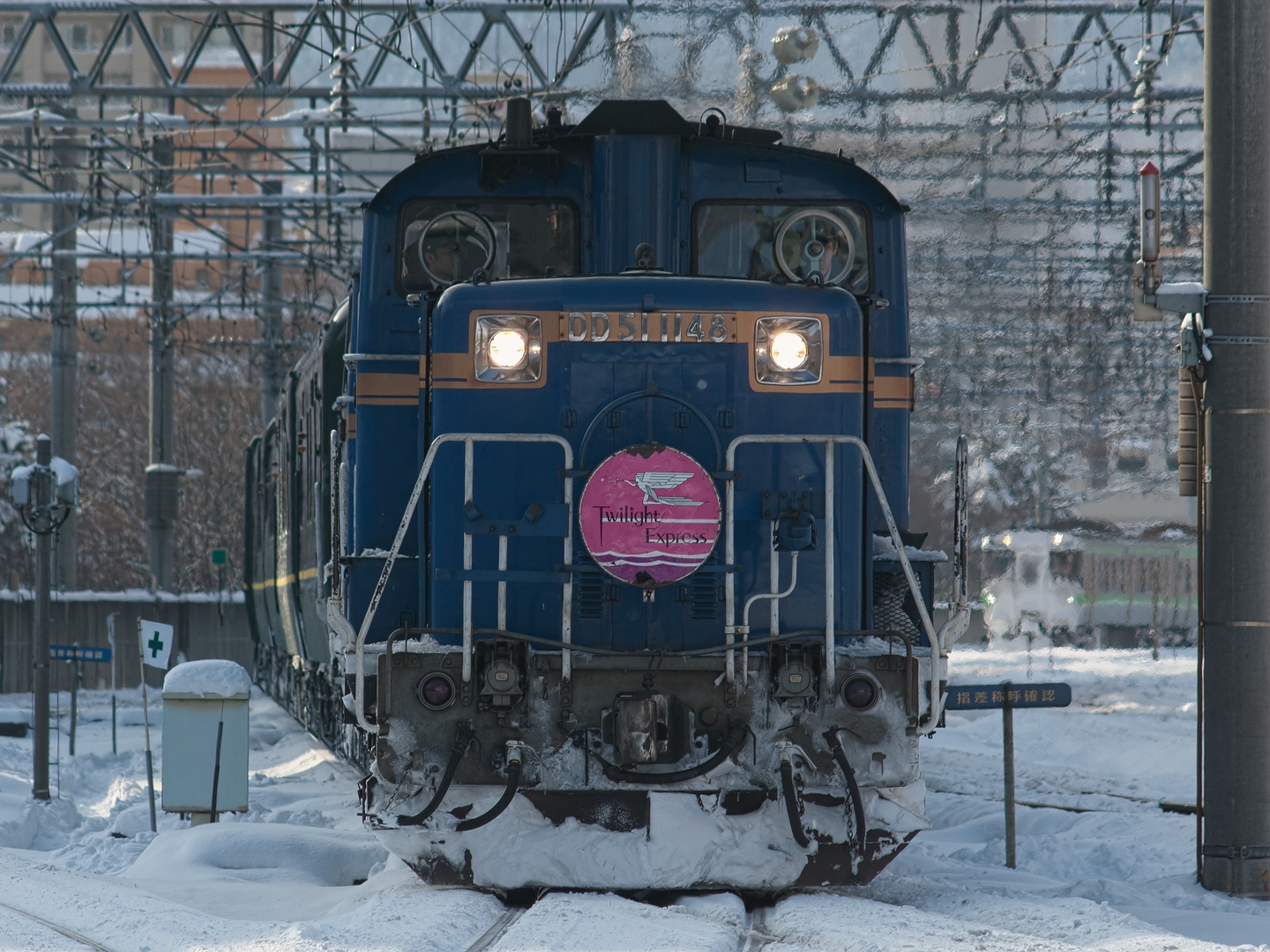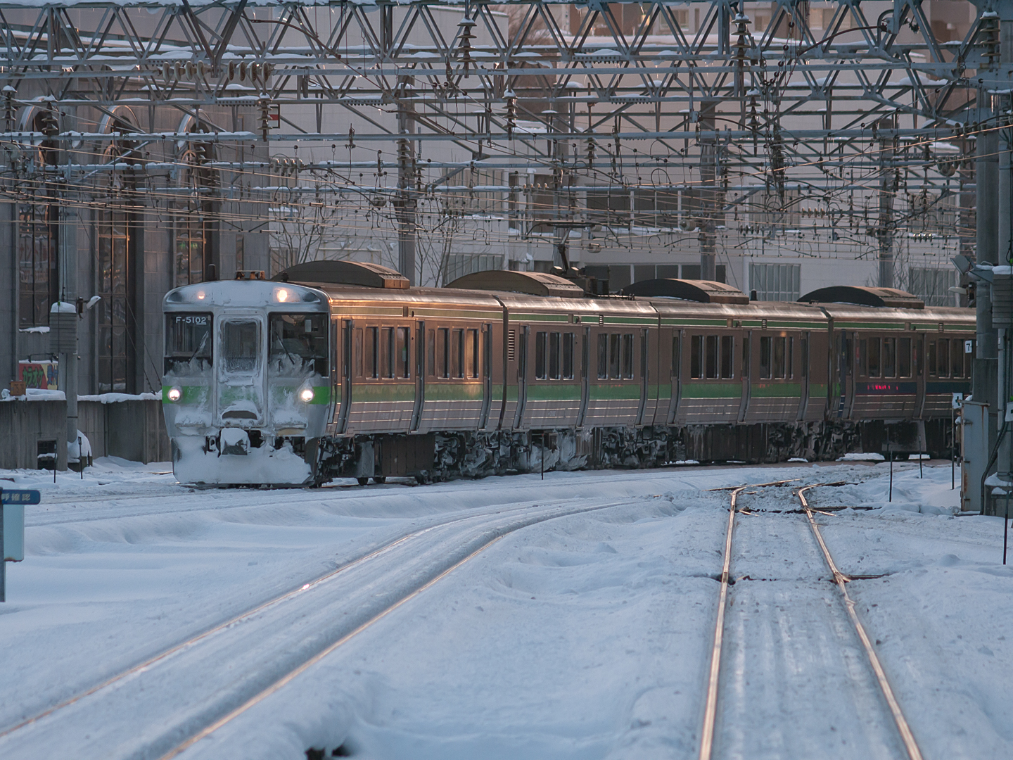 2011 01/08 17:56:04 今日は狸小路の床屋へ行った帰りに トワイライトエクスプレスを待ってみた。 時刻表および撮影時刻からすると、 月水金を除く日の13時45分頃から 札幌駅ホーム西側に居ると丁度良い感じ。 さらについでで猫にも会ってきたが、 撮る前に近くに落雪し 逃げてしまった。 OLYMPUS ZUIKO MC AUTO-T 200mm F4 |