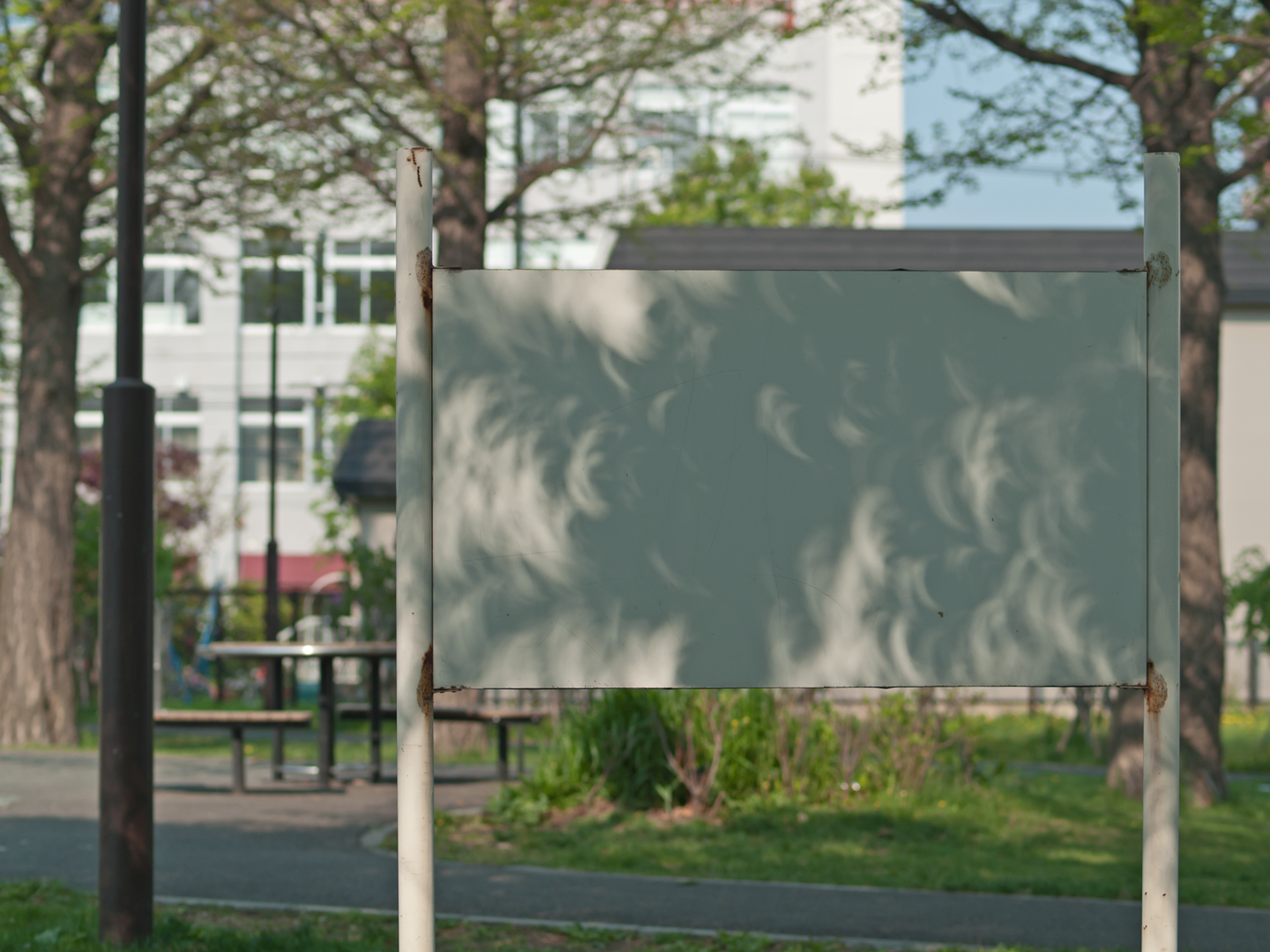 2012 05/21 09:12:50 とりあえず近くの公園で。細い方が ちょうど 札幌での最大時刻に撮影したもの。 (画角は半分にクロップ) 木漏れ日なども同じ形に欠けていた。 ちなみに機材は、フジフイルムのND4.0を ステップダウンリングに接着して使用。 感度100のF11.0(テレコン分込み) シャッター速度は1000分の1。 SIGMA APO MACRO 150mm F2.8 EX DG HSM + EC-14 |